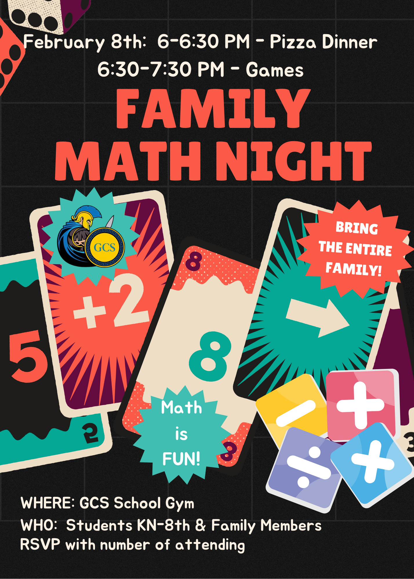 FAMILY MATH NIGHT Join you fellow Gladiators and their families for our annual Math Night on February 8th! The fun starts with Pizza at 6PM! Let us know you are coming: Family Math Night RSVP Print